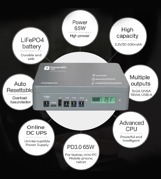 PowerGo Boost Pro - Mini batterie au Lithium Lifepo4 5V 12V 19V, 30 000mAh, 96wh, longue sauvegarde, avec USB-C, alimentation 3.0, pour routeur wifi (Fibre Optique), ordinateur, camera et autres
